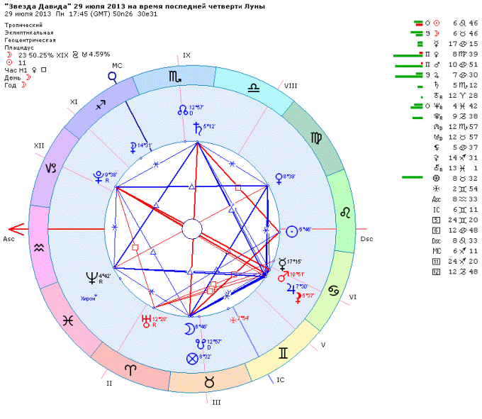 | 29 июля 2013 года - «Звезда Давида» и последняя четверть Луны. Елена Зимовец 29 июля 2013 года сложится редкостная конфигурация планет - «Звезда Давида» или гексаграмма – шестиконечная звезда. Это конфигурация в которой два больших тригона: один – вершиной вверх, другой – вершиной вниз, вписанны в круг Зодиака. Они образуют 6 равноудаленных точек в радиусе 360 градус – 6 планет в секстиле (60°), при этом складывается три оппозиции между тремя парами планет. Гексаграмма – древний символ. Существуют различные версии его названия. Этот знак известен в Индии как Анахата или Анахата-чакра и использовался там, задолго до того, как появился на Ближнем Востоке и в Европе. Сейчас его связывают с легендой о форме щитов воинов царя Давида: «Звезда Давида» (ивр. מָגֵן דָּוִד — Маге́н Дави́д, «Щит Давида». Другой его вариант известен под именем «Печать царя Соломона». Звезда Давида в натальной карте В астрологии такую конфигурацию планет называют Большой Секстиль. С участием реальных планетах она складывается очень редко, так как для её образования 6 из 10 планет должны быть на строго определённом расстоянии друг от друга. Чаще эта конфигурация бывает с участием фиктивных планет или точек: Чёрной или Белой Луны, Фортуны или Узлов Луны. За свою практику я встречала только один гороскоп где бы Звезда Давида была на реальных планетах, это гороскоп Лаймы Вайкуле (31 марта 1954г.). В обозримом прошлом планеты образовывали «Звезду Давида»: 07 февраля 1945, 31 марта 1954 года, 21-22 июля 1995 года. Вот мнение нескольких известных астрологов о звезде Давида (гексаграмме) в натальной карте. «Конфигурация гексагона предлагает нативу исключительные возможности, блестящую способность к общению с другими людьми. Опасность Зведы Давида заключается в трате энергии из-за повышенной многоликости, разнообразных интересов и многочисленных возможностей. Помочь в этой трудности могут напряжённые аспекты». (М.Марч и Дж.Мак-Эверс) «Такая конфигурация получается, когда четыре планеты составляют секстили и трины и образуется прямоугольник, геометрические пропорции которого указывают на мистическое значение. <…> Во всех подобных планетных паттернах можно предполагать также определенные личностные проблемы, которые могут проявиться как психологические комплексы, подталкивающие личность к асоциальности или нагружающие ее сверхличной, планетарной ответственностью, требующей строгого сосредоточения и особого мировоззрения. С другой стороны, карта без особого сосредоточения может означать разбросанную личность, но также и существо, судьба которого – связывать, гармонизировать, символизировать собою целостность бытия. Это может быть печатью истинной индивидуальности, приближения к совершенству». (Дэйн Радьяр) «Гексагон говорит о том, что натив во всём защищён, но он не избегает внутренних перестроек, он будет менять форму, ко всему приспосабливаться, но внутренняя сущность останется неизменной: "какой он был в люльке, такой будет и в могилке". Если в гексагон не входит Лилит, а Селена входит, то данная конфигурация будет всемогущей». (П.П.Глоба) «Звезда Давида» 29 июля 2013 года Два больших тригона в «Звезде Давида» акцентируют две стихи: янские – огонь и воздух, или иньские – земля и вода. 29 июля 2013 года Звезда Давида будет сочетать две иньские стихии: водный тригон и земной. Водный т